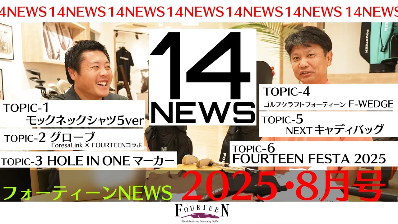 FOURTEENの最新情報を公式にお届けする「14NEWS 2025年8月号」。 新作アパレル・コラボアイテム・ギアの詳細、さらに来年開催予定のFOURTEEN FESTAまで、幅広くご紹介いたします。 TOPIC-1 25SSモックネックシャツ TOPIC-2フォーサリンク × FOURTEEN グローブ TOPIC-3 記念マーカー TOPIC-4 FOURTEEN FESTA2025 TOPIC-5 NEXTキャディバック TOPIC-6 GOLF CRAFT FOURTEEN F-WEDGE FDMN20521 https://www.fourteen.jp/products/apparel/tops/detail.php?id=373 GB0101【レーザー刻印入り】 https://www.fourteen.jp/products/accessories/shaft_parts/detail.php?id=390 FOURTEENが提案する最新プロダクトとイベントを、ぜひご覧ください。 ゴルフがもっと楽しくなる最新トピックをぜひチェックしてください! チャンネル登録・高評価もよろしくお願いします