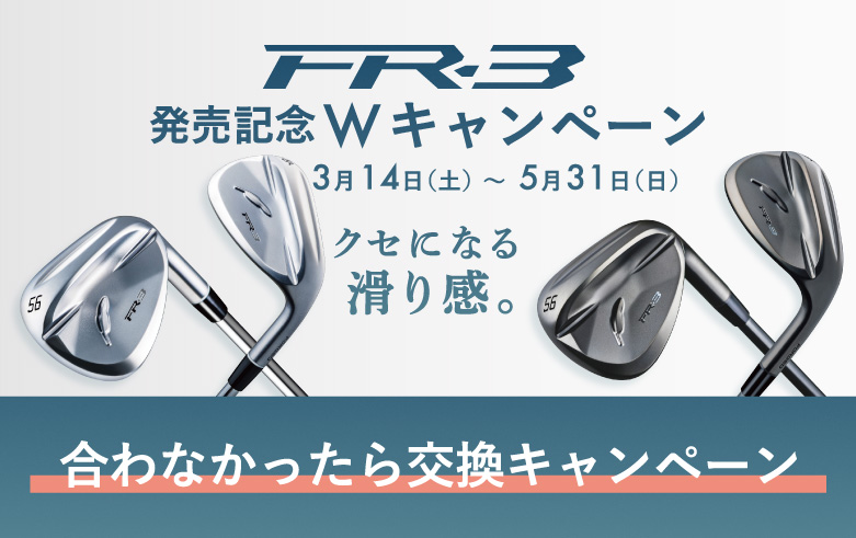 FR-3 ウェッジ ダイヤモンドブラックサテン仕上げ (税込) 本商品は2026年4月17日発売の予約注文商品となります。 発売日以降、順次お届けとなります。何卒ご了承ください。 カートに入れる *ログインすると会員価格が表示されます。 *お届けについて > / 返品・キャンセルについて > シャフト --シャフト-- DS91wBK フレックス --フレックス-- WEDGE ロフト --ロフト-- 46 48 50 52 54 56 58 グリップ --グリップ-- FOCHラバーM60R(TYPE4) BL無し 【2026年4月17日発売】 もうバンカーで悩まない! 新キャニオンソールで バンカーショットを自信の1 打へ。 ヘッド:軟鉄一体鍛造製法(S20C) 仕上げ:ダイヤモンドブラックサテン仕上げ シャフト:N.S.PRO DS-91w BK スチールシャフト(WEDGE/96g) グリップ:FOCHラバーM60R(TYPE4) BL無し ■希望小売価格:¥30,800/本(税込) MADE IN JAPAN カスタムシャフト・グリップ 貸出試打クラブのお申込み パールサテン仕上げはこちら カスタム仕様はこちら LINEでクラブ診断 spec detail 公式オンラインストア限定「合わなかったら交換キャンペーン」 期間中、公式オンラインストアで『FR-3』をご購入いただき、ロフト・スペックが合わなかった場合、一回に限り交換できます。 ※標準品のみとさせていただきます。 キャンペーン期間 2026/3/14(土)~2026/5/31(日) 交換キャンペーン有効期限 2026年6月30日まで 交換方法 下記メールアドレスに ①注文番号 ②交換希望の旨 ③氏名 ④交換希望商品スペック を記入し、送信してください。 online-store@fourteen.co.jp キャンペーンの詳細はこちら 公式オンラインストア会員限定「まとめ買いキャンペーン」 期間中、対象商品を複数本ご購入いただいた方を対象に、 2本購入→2,000pt 3本購入→4,000pt 4本購入→7,000pt を差し上げます! キャンペーン期間 2026/3/14(土)~2026/5/31(日) キャンペーンの詳細はこちら 公式オンラインストア限定 FR-3先行予約キャンペーン 3月14日より、対象製品をご予約いただいた先着40名様に、オリジナルラウンドポーチ(RP0101)をプレゼントいたします。 FR-3ウェッジとともに、洗練されたデザインと機能性を兼ね備えたポーチを手に入れるチャンス。この機会をぜひお見逃しなく。 キャンペーン期間 2026/3/14(土)~ ※先着順 キャンペーンの詳細はこちら 硬い?軟らかい? バンカーの砂質を選ばないWバウンス効果はーー、 クセになる滑り感。 フロントはローバウンス効果、 バックはハイバウンス効果。 つまり・・・Wバウンス効果で とことんソールが滑る。 新キャニオンソール ウェッジパフォーマンスの命、ソール。 とくにウェッジワークが苦手に感じていたり、 とにかくシンプルにミスを防ぎたいと感じたり、 ウェッジに“お助け”機能を求めるゴルファーのために 新キャニオンソールを開発しました。 「ローバウンス効果」(刺せる)、「ハイバウンス効果」(跳ねる)、 2つの要素を融合させた新キャニオンソールは、 ボール手前の砂からヘッドをダフらせていく バンカーショットにめっぽう強いのです。 “つるん”と砂面を滑る新感覚のWバウンス効果 FR-3の新キャニオンソール フロントソール 強烈なアシストバウンス効果 リーディングエッジを刺していき、 硬い砂でもボールの下へソールを潜らせて バックソール効果をアシスト バックソール 緩やかになったソールの 受け面によって、砂面を滑るような ハイバウンス効果で ヘッド抜けを強く促す。 とにかくスクエアに構えて シンプルに打てば ボールをシンプルに運んでくれる! ソールの進化でよりバンカーショットが やさしく成功できる充実感が増した。 中央部の渓谷部が浅めに調整された新キャニオンソールの「FR-3」は、フロント部からうまくバックソールの面が緩やかに砂面(芝面)にコンタクトするため、「DJ-6」よりも明らかな滑り感が加わっています。 圧倒的なソールの寛容性、やさしさはそのままに、ボールの飛び方はソフトになって、より操作感が増したのが「FR-3」です。 全てはやさしさでサポートできる フォーティーンウェッジの信頼機能 安定したヘッド挙動 トップブレードを上方向に、さらにトゥ方向に厚みを持たせたW逆テーパーブレードはインパクトのヘッド挙動を抑えて打点ブレでも安定した距離感へ貢献します。 ピュア鍛造ヘッドのソフトな打感 「TB-3 FORGED」の多面シアターブレードを踏襲し、(インパクトの振動を抑える)鍛造ヘッドならではのソフトな打感の1 打がフィーリングを向上させます。 安定したハイスピン性能 FR PROJECT で進化したハイスピンミラー鍛造フェースを採用。 フェースの超平面精度、そしてルールギリギリの溝エッジにレーザーミーリングを加えて、あらゆるライやウェットな状態でも安定したハイスピンショットを放つことができます。 SHAFT DS-91w 「ちょうど良い振りやすさ」と「クラブとしての使いやすさ」を求めて、開発した96gのウェッジ専用スチールシャフト。 確実にグリーンをキャッチする定番のウェッジとして、幅広いゴルファーへの対応を可能としています。 シャフトカラーもヘッ